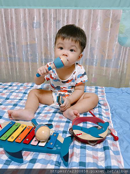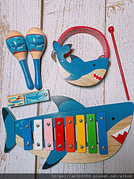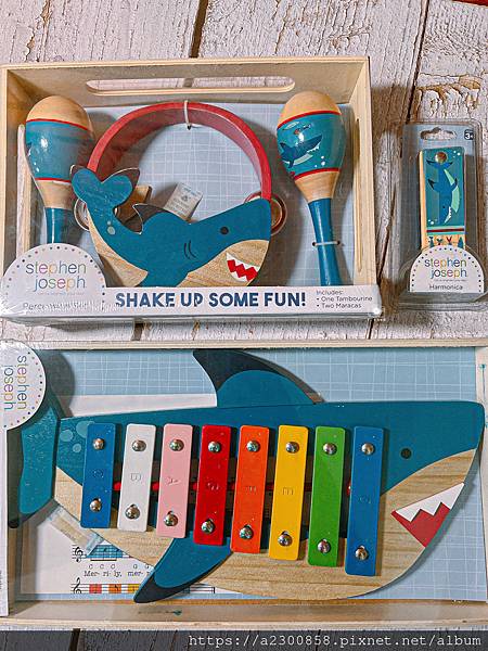Stephen Joseph木質系列音樂組有蠻多圖案可以選,共有五款圖案,湯蒝爸媽幫小湯蒝挑選的是鯊魚款式,選了打擊樂器組、木琴、口琴三款樂器組合,就讓湯蒝爸媽來分享小湯蒝使用Stephen Joseph音樂啟蒙樂器吧!