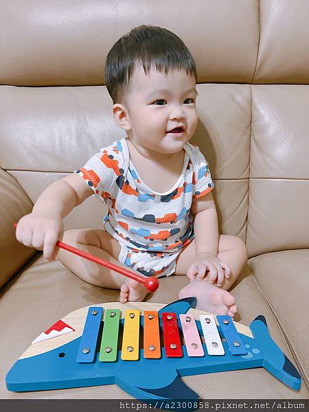 木琴琴身上不僅有可愛的鯊魚圖案造型,琴身上為彩色8音階構造 , 家裡原本就有類似的大木琴,而且湯蒝阿嬤也常帶著小湯蒝敲打,所以小湯蒝看到這款小木琴,熟能生巧的拿起鼓棒,輕鬆敲打著木琴並敲出發出悅耳的音樂