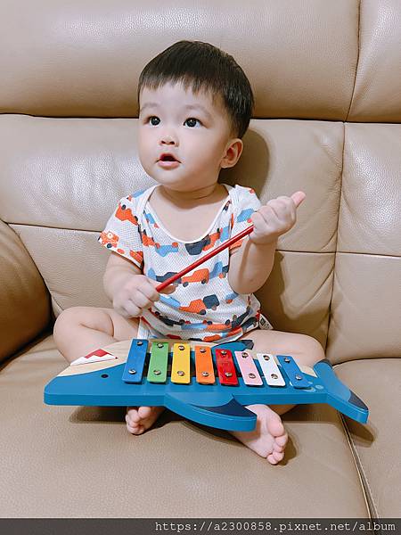 湯蒝爸媽看著小湯蒝敲打木琴,發現對聲音的敏銳度越來越棒,真的超開心,而且拿鼓棒還能訓練寶寶的肌肉群,訓練手肌能力