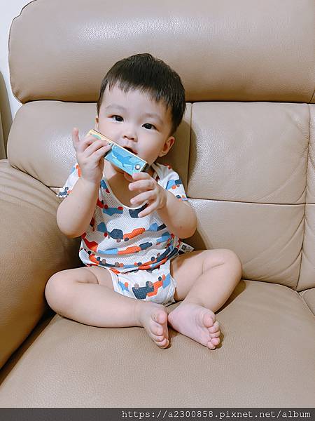 小湯蒝看到湯蒝媽拿起口琴發出聲音,也迫不急待的想拿去嘗試看看,嘗試吹奏了好幾次,雖然都沒發出聲音,但看小湯蒝努力的嘗試,讓湯蒝爸媽覺得這已經訓練寶寶的耐心與專注力了,再多嘗試幾次,說不定就找到訣竅,能吹出動人且動聽的音樂了呢